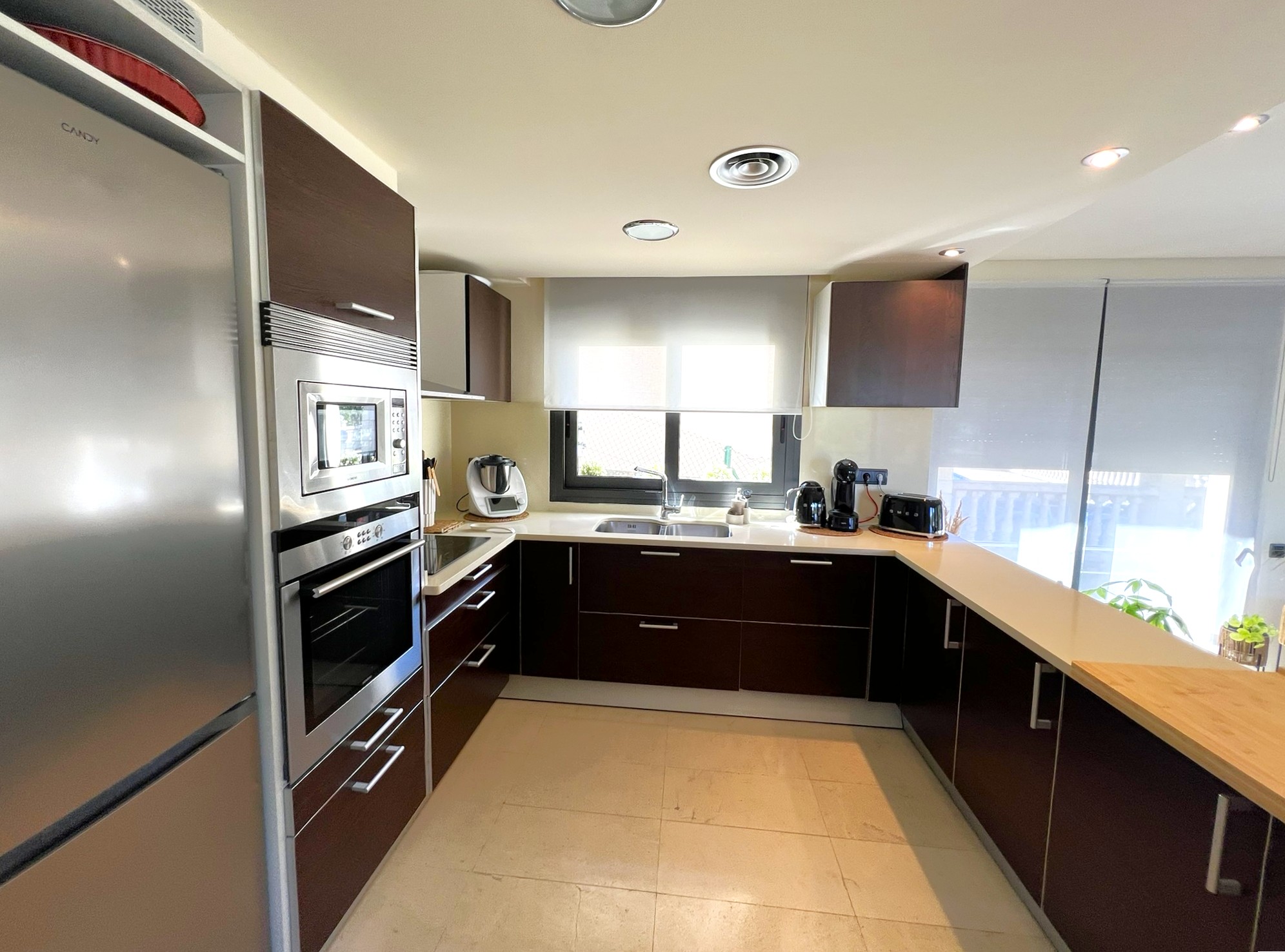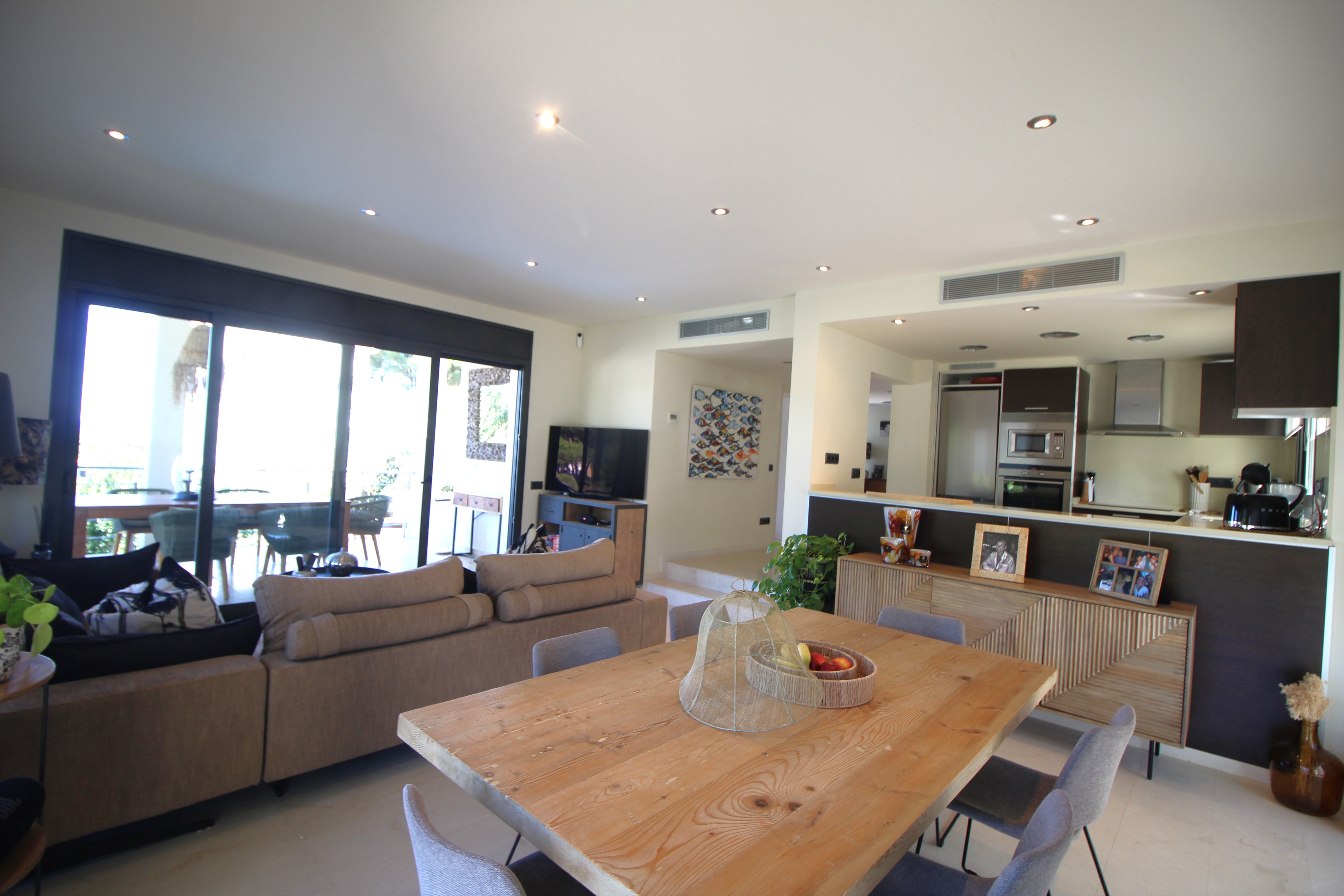 La propriété est répartie sur trois niveaux conçus pour offrir confort et fonctionnalité dans chaque espace. Au rez-de-chaussée, on trouve un garage pouvant accueillir un véhicule, une salle de bain complète, une chambre double et une cuisine entièrement équipée ouverte sur le lumineux salon-salle à manger, avec accès direct à la terrasse et à la piscine privée.